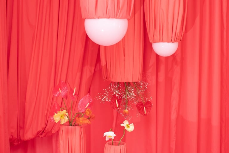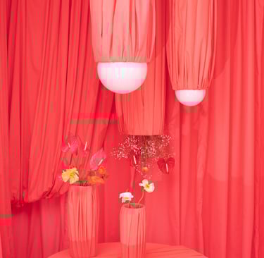 Érase una vez una diseñadora jugando a crear una fantasía efímera entre colores salmones, rosas y rojos, creando un pequeño mundo imaginario en el campo de telar, revestido de rojo, naturaleza y movimiento.