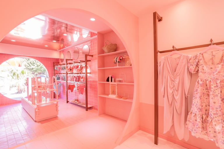 Para el área de trajes de baño se diseñó una experiencia inmersiva que evoca la sensación de estar dentro de una alberca o una pecera. La intención fue sumergir a los visitantes en un pequeño universo acuático en tonos rosa, donde la escalera de piscina se convierte en el elemento focal del espacio