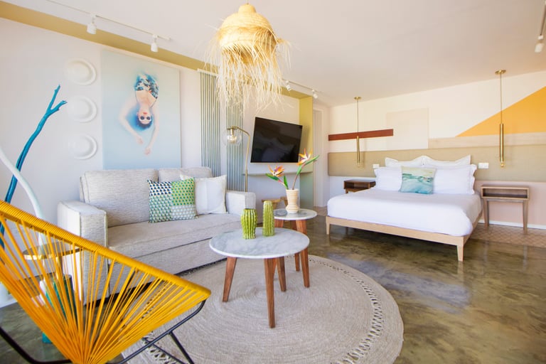 La propuesta combina una estética moderna con sutiles acentos rústicos, incorporando piezas de mobiliario local y elementos representativos de la tradición regional. El resultado es un espacio que conecta con el paisaje y la cultura del lugar, creando una atmósfera cálida, auténtica y profundamente ligada al espíritu sudcaliforniano.