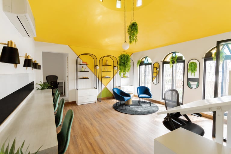 El color amarillo, distintivo de Yellow Piña, se integra como el protagonista del proyecto. Este tono representa la identidad de la marca y se incorporó de manera intencional dentro del espacio para reforzar su carácter y hacerlo parte de su sello visual. Así como lograr darle a la atmosefera de trabajo una emoción vibrante, activa y alegre.